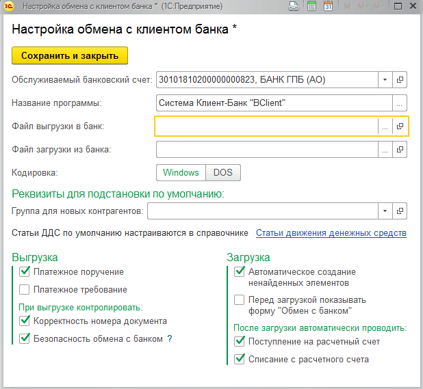 Далее открываем форму «Обмен с банком», переходим в раздел «Настройка». В данном окне заполняем информационные сведения по счёту, название банковской программы и указываем путь к файлам выгрузки и загрузки данных. Также не забываем проставить необходимые функциональные флажки по «Выгрузке» и «Загрузке», которые необходимы для вашей работы в программе.