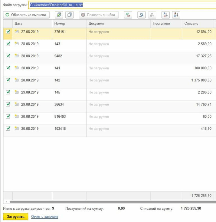 После того как мы выполнили все необходимые настройки, переходим к самой загрузке банковской выписки. Выписка в 1С загружается в формате «Текстовый документ (.txt)». Из «Обмена с банком» после загрузки файла мы видим документы со знаком «Не загружен» за выбранный период (день, неделя, месяц). По кнопке «Загрузить» документы попадают в «Банковскую выписку».