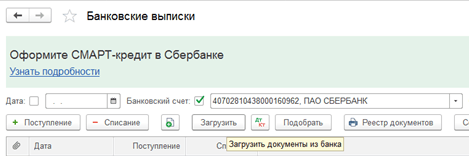 Есть ещё один вариант загрузки выписки. Это кнопка «Загрузить» в разделе «Банк и касса» – «Банковская выписка». При нажатии на неё мы также перенесёмся в форму «Обмен с банком».