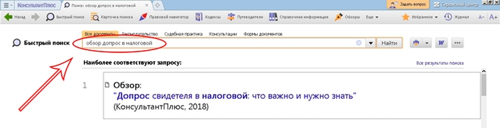 Чтобы найти обзор, напишите в строке «Быстрого поиска» следующую фразу: «обзор допрос в налоговой». Дайте команду на поиск. Результат поиска представлен ниже на рисунке.