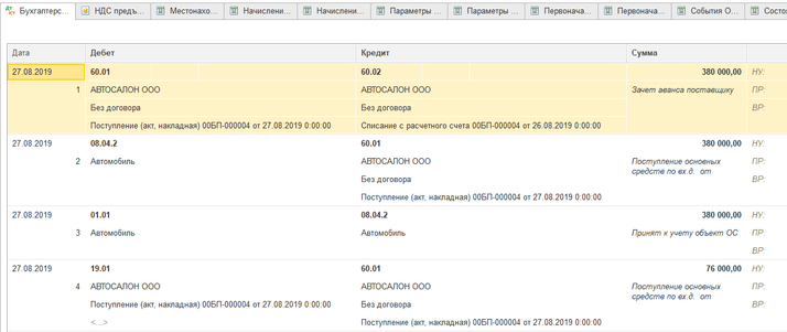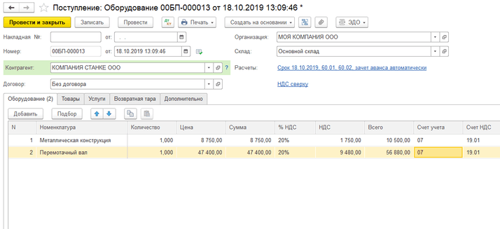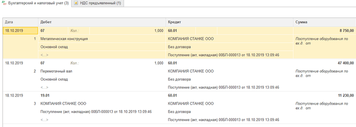 Встречаются такие ситуации, когда перед вводом объекта в эксплуатацию требуется произвести дополнительные действия, например, ОС требуется собрать из нескольких комплектующих. Для таких случаев существует второй способ принятия ОС к учёту: с помощью документа «Поступление оборудования» (закладка «ОС и НМА»). В табличной части этого документа указывается оборудование из справочника «Номенклатура», счёт учёта для комплектующих объектов ОС – 07, для НДС предусмотрен счет 19.01. При проведении программой будут сформированы проводки Д07 К60.01 и Д19.01 К60.01 (рис. 3, рис. 4).