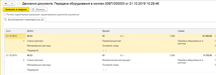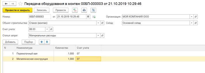 Когда требуется дополнительная сборка ОС, вводится документ «Передача оборудования в монтаж». В нём выбираются элементы, из которых будет собрано ОС. Это могут быть материалы, учтённые на счёте 10 или компонент ОС – на счёте 07. Также следует обратить внимание, что счёт учёта в табличной части указывается 08.03 «Строительство объектов основных средств». На этом счёте будет собираться стоимость объекта ОС, которая в последующем будет перенесена на счёт 01.01 (рис. 5, рис. 6). Обратите внимание, к счёту 08.03 обязательно должен указываться объект строительства, по которому будет осуществляться подсчёт стоимости.