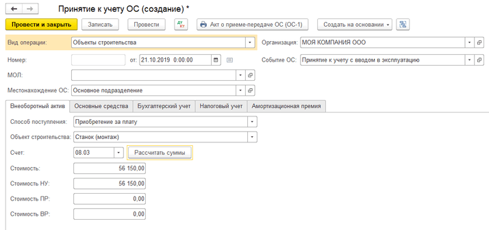 После того, как все затраты собраны на счёте 08.03, мы можем принять объект к учёту. Для этой операции предусмотрен документ «Принятие к учёту ОС» (рис. 7). Он имеет пять вкладок. На закладке «Внеоборотный актив» указывается способ поступления, в программе реализованы несколько вариантов, пользователь выбирает наиболее подходящий для себя. Обязательно указываем объект строительства и счёт учёта 08.03. По кнопке «Рассчитать суммы» мы узнаем первоначальную стоимость объекта. Далее заполняется вкладка «Основные средства», в которой выбирается ОС из справочника «Основные средства». На закладке «Бухгалтерский учёт» указывается счёт учёта, для ОС это 01.01, выбираем порядок учёта ОС и параметры начисления амортизации. Далее идёт вкладка «Налоговый учёт»: по некоторым объектам ОС всю первоначальную стоимость мы можем сразу включить в расходы. И пятая вкладка называется «Амортизационная премия», на которой, если нужно, заполняется коэффициент.