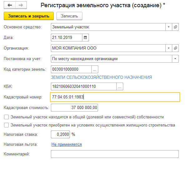 Приобретение земельных участков отражается документом «Приобретение земельных участков» (раздел «ОС и НМА»). После заполнения шапки в табличной части указывается земельный участок из справочника ОС, сумма и счёт учёта (рис. 8). После проведения программа сформирует проводки Д08.01.2 К60.1 и Д01.08 К08.01.2. Для того чтобы происходило начисление земельного налога, в карточке ОС нужно перейти по гиперссылке «Регистрация земельных участков» и заполнить форму (рис. 9).