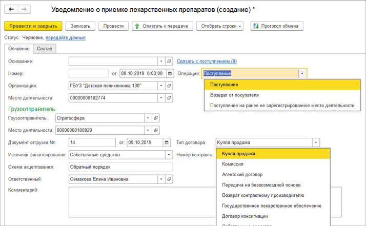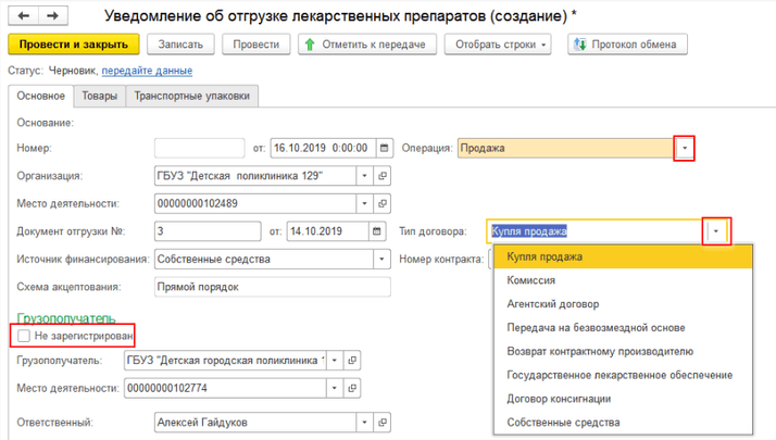 При отгрузке лекарственных средств (при создании уведомления об отгрузке товаров) необходимо на закладке «Основное» заполнить данные отправителя и получателя. Если товар передаётся контрагенту, который не зарегистрирован в системе МДЛП, то необходимо поставить необходимую галочку и выбрать необходимую информацию во вкладках «Операция» и «Тип договора» (рис. 4, 5).