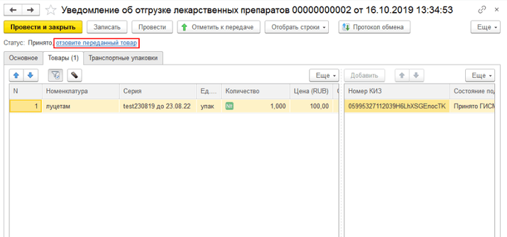 На вкладке «Товары» необходимо просканировать отгружаемые упаковки, либо загрузить номера КиЗ из ТСД, либо ввести вручную по кнопке «Добавить» и передать данные в ИС МДЛП. После произведённого обмена с системой до подтверждения получателем информации об отгрузке можно отозвать переданные товары. Если отгружается транспортная упаковка, то её код вносится на закладке «Транспортные упаковки».