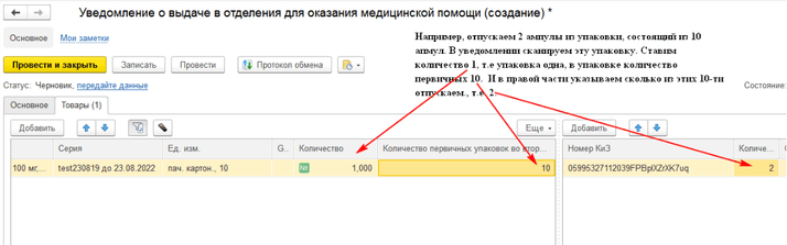 Для того, чтобы лекарственные препараты могли быть перемещены в отделение организации, необходимо создать уведомление о выдаче в отделение для оказания медицинской помощи. На закладке «Основное» заполняем все необходимые сведения. Если в 1С подключён регистратор выбытия, то необходимо поставить галочку «Использовать РВ». Уведомления о выдаче для оказания медицинской помощи будут передаваться в ИС МДЛП через РВ.
