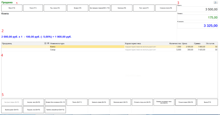 Интерфейс режима «Регистрация продаж» можно разделить на пять зон.
