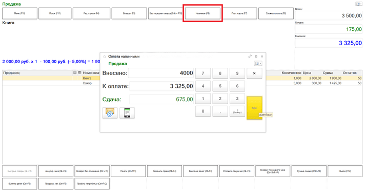 Например, оплата наличными – для этого на верхней панели кнопка «Наличные» необходимо ввести сумму, которую дал покупатель. Чек готов к пробитию. Согласно Федеральному закону 54-ФЗ «О применении контрольно-кассовой техники» покупатель может попросить отправить чек по смс или на эл. почту. Важно, что номер или адрес эл. почты нужно ввести до пробития чека. Для пробития чека нажать кнопку «Enter», автоматически чек распечатается на кассовом аппарате.