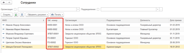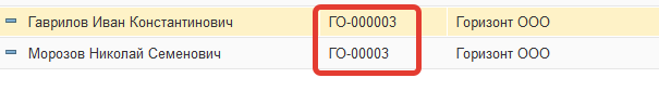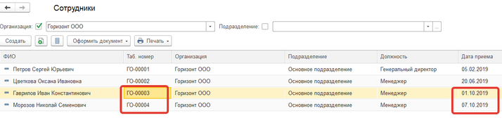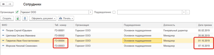 С какими трудностями можно столкнуться при изменении табельного номера сотрудника, рассмотрим на примере. Предположим, что в ООО «Горизонт» с разницей в несколько дней были приняты на работу сотрудники Гаврилов И. К. и Морозов Н. С. Однако при оформлении приёма на работу в программе 1С:Бухгалтерия предприятия ред. 3.0 по ошибке сначала приняли на работу сотрудника Морозова Н. С., а потом Гаврилова И. К. Соответственно, табельные номера сотрудникам были присвоены с нарушением хронологии.