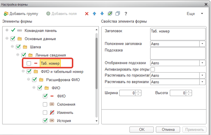 В списке реквизитов имеется «Таб. номер», но по умолчанию с этого реквизита снят флажок.