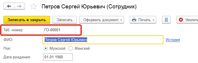 Устанавливаем флаг, нажимаем «Применить» или «ОК», и табельный номер появляется в карточке сотрудника.