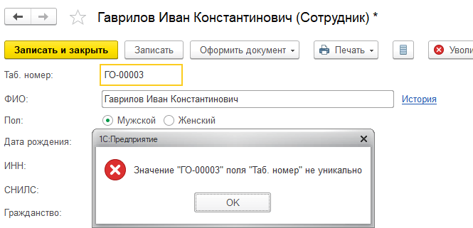 Попытаемся изменить табельный номер Гаврилова И. К. на ГО-0003. Появится сообщение, что такой номер уже зарегистрирован.