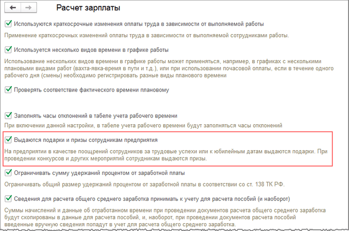 Далее рассмотрим получение дохода в виде стоимости подарка в программе 1С:Зарплата и управление персоналом ред. 3.1. Сначала необходимо проверить настройки: переходим в раздел «Настройка» ‒ «Расчёт зарплаты», устанавливаем флажок «Выдаются подарки и призы сотрудникам предприятия».