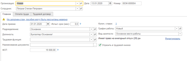 Для того чтобы в сведениях о трудовой деятельности отразились кадровые мероприятия по сотрудникам, необходимо установить в кадровых документах «Приём на работу», «Увольнение», «Кадровой перевод» флажок «Отразить в трудовой книжке». Если флажок не будет установлен, кадровое мероприятие не отразится в форме СЗВ-ТД.