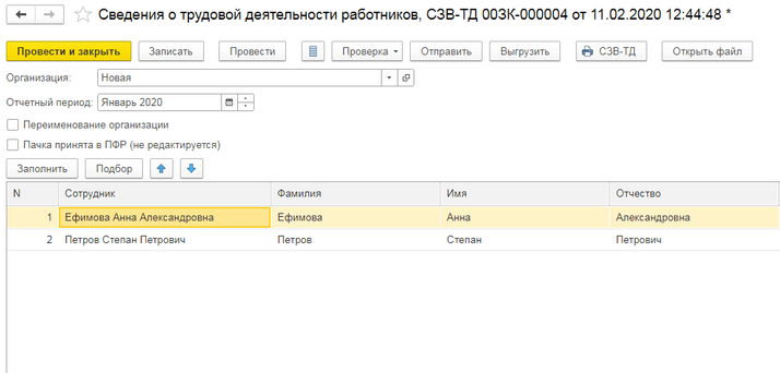 Далее формируем сам отчёт: раздел «Кадры» или «Отчётность, справки» – журнал «Электронные трудовые книжки» или сервис «1С-Отчётность» – папка «Отчетность по физлицам» ‒ кнопка «Создать». Выберите документ «Сведения о трудовой деятельности работников» (СЗВ-ТД). Если в информационной базе зарегистрировано более одной организации, то в поле «Организация» выберите организацию, по сотрудникам которой необходимо сформировать сведения. В поле «Дата» укажите дату заполнения формы (по умолчанию указывается текущая дата). В поле «Отчётный период» укажите отчётный период (месяц). Табличная часть документа заполняется автоматически по кнопке «Заполнить». Документ заполняется по имеющимся в программе кадровым мероприятиям (приём, перевод, увольнение) за отчётный месяц. Также табличную часть можно заполнить по кнопке «Подбор» и по кнопке «Добавить» (в табличной части нажмите на правую кнопку мыши). Поля «Руководитель» и «Должность» заполняются автоматически данными, введёнными в справочник организации (закладка «Учётная политика» и другие настройки – ссылка «Ответственные лица»). Данные о руководителе организации (Ф.И.О. и должность) указываются в печатной форме СЗВ-ТД. Если отправка сведений в ПФР производится в электронном виде, то отправка должна осуществляться с ЭЦП именно этого лица.