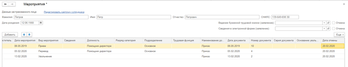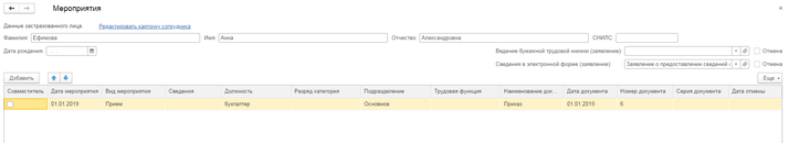 Чтобы перейти непосредственно в сформированные сведения, щёлкните двойным щелчком мыши (или кнопкой Enter) по строке с сотрудником. В результате открывается форма «Мероприятия».