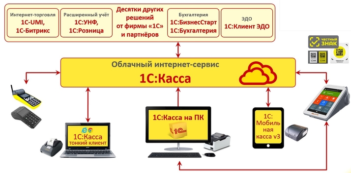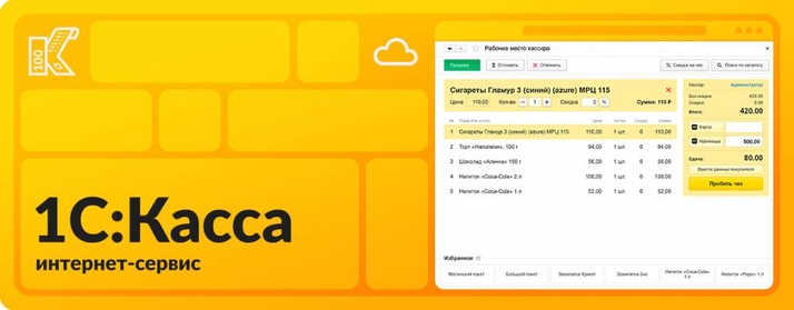 Ядром данной системы является обновлённый интернет-сервис 1С:Касса. Ваши данные будут находиться в облаке 1cfresh (доступ осуществляется при помощи веб-браузера, а также через бесплатный тонкий клиент, устанавливаемый на ПК).