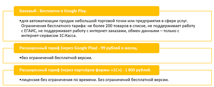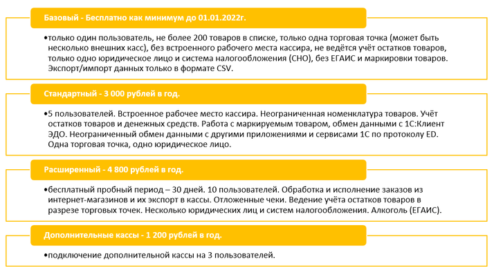 Для пользователей приложения 1С:Касса доступны следующие тарифы.