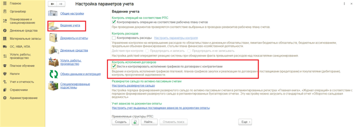 Для включения возможности использования функционала необходимо в «Настройках параметров учёта» установить флаг «Контроль исполнения договоров».