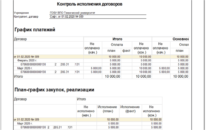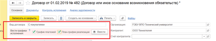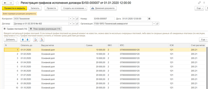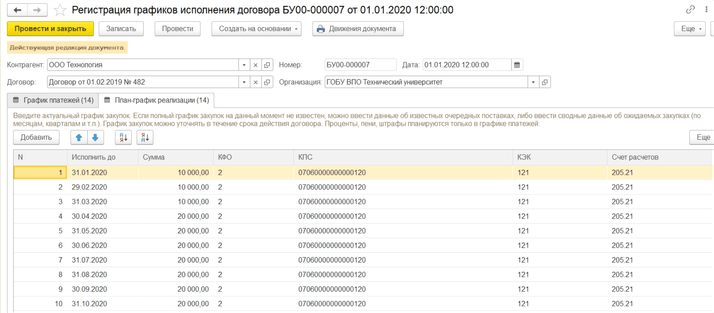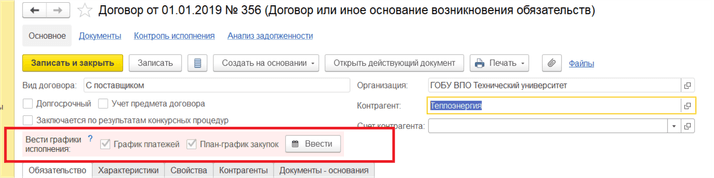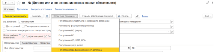 или в документе «Регистрация графиков исполнения договора», который можно создать из карточки договора.