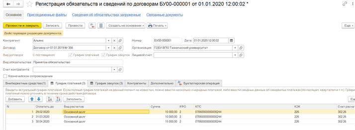 График платежей можно ввести в документе по принятию обязательств «Регистрация обязательств и сведений по договорам».