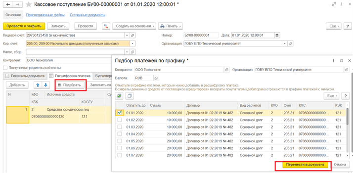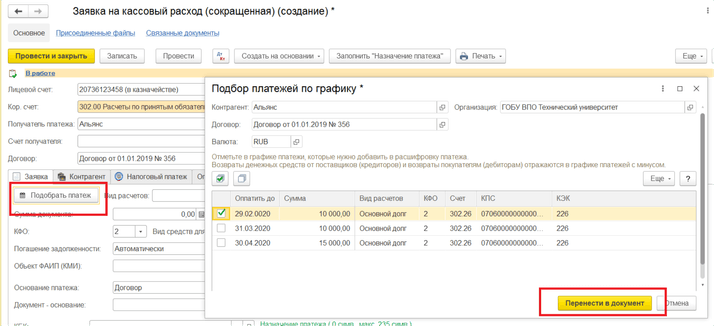 Если для договора ведётся график исполнения, то в платёжных документах при выборе такого договора появляется кнопка «Подобрать платёж», по которой открывается график платежей. В нём можно выбрать текущий платёж и перенести в документ. При этом в документе заполняются реквизиты «Вид расчётов», «Сумма документа», «КБК», «КОСГУ», которые указаны в графике.