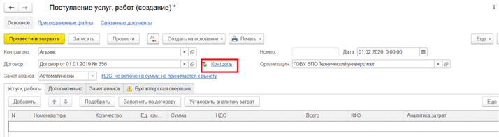В документе «Поступление услуг, работ» при выборе договора, по которому ведётся график исполнения, появляется ссылка «Контроль», с её помощью можно проанализировать исполнение договора на дату документа. Использование этой ссылки будет подробно рассмотрено далее на примере договора с покупателем.