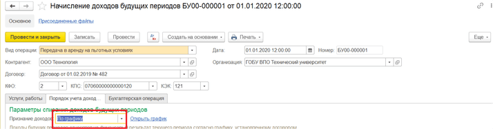 Для договоров операционной аренды с неравномерным графиком платежей в документе «Начисление доходов будущих периодов» в поле «Признание доходов» нужно выбрать значение «По графику».