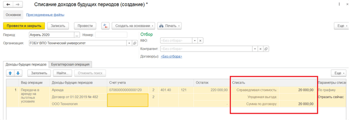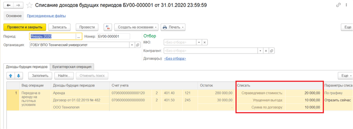 Для отражения операций по признанию доходов и расходов (по упущенной выгоде) текущего периода в программе используется документ «Списание доходов будущих периодов». Табличная часть документа будет заполняться автоматически по кнопке «Заполнить» в соответствии с введённым планом-графиком реализации.