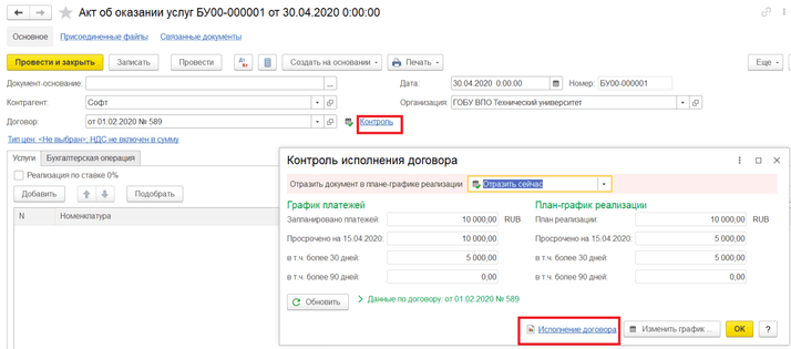 В при включённом функционале по контролю исполнения договоров в документах поставки товаров, работ, услуг, которые введены для договоров с ведением графиков, появляется ссылка «Контроль». По ссылке открывается форма «Контроль исполнения договоров». Из формы также по ссылке можно сформировать отчёт «Контроль исполнения договоров», с помощью которых можно проанализировать текущую задолженность по контрагенту, в том числе и просроченную.