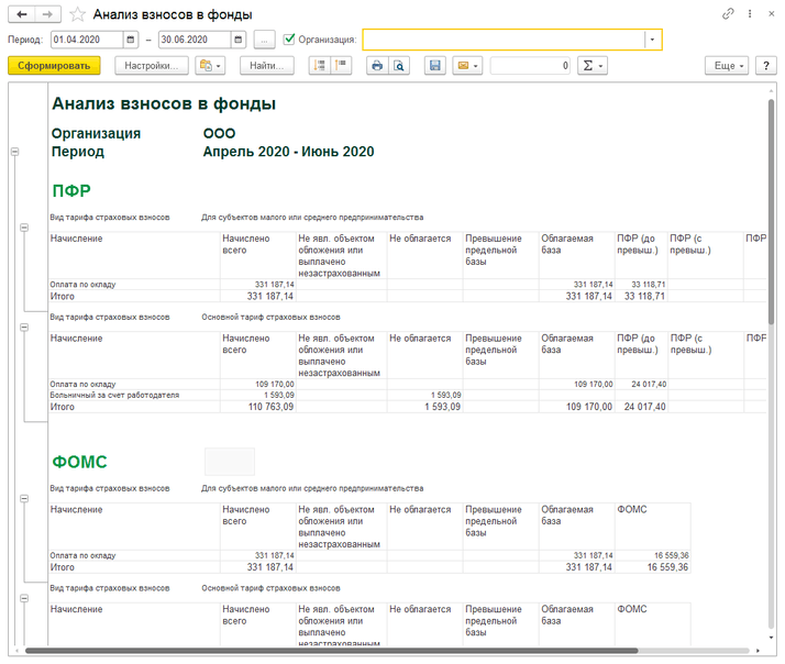 Если в настройке «Налоги и отчеты» установлен пониженный тариф страховых взносов «Для субъектов малого или среднего предпринимательства», то при начислении зарплаты взносы будут рассчитаны с учетом ставки 15%. Проверить расчет перед составлением отчетности можно через отчет «Анализ взносов в фонды» (раздел Зарплата и кадры – Отчеты по зарплате). Отчет включает деление на фонды, а также деление внутри фондов на две таблицы: 1 – для вида страховых взносов «Для субъектов малого или среднего предпринимательства»; 2 – для вида «Основной тариф страховых взносов» (рис.1).