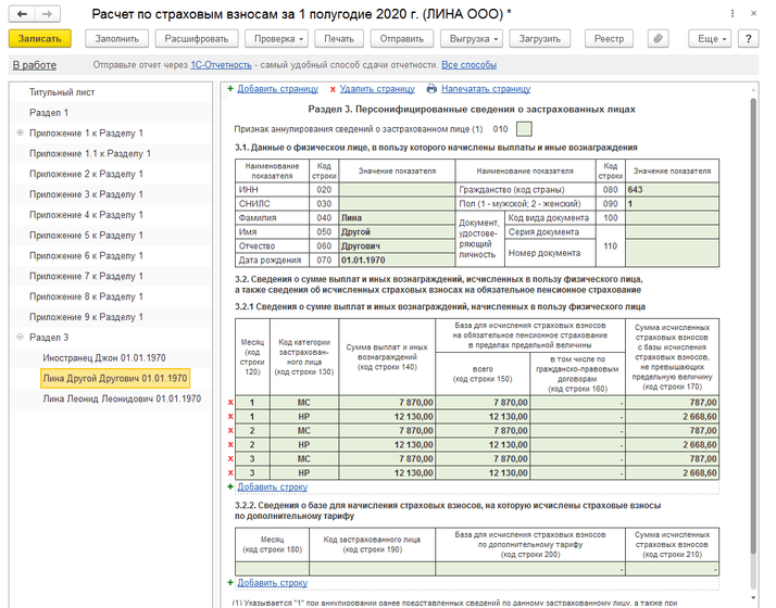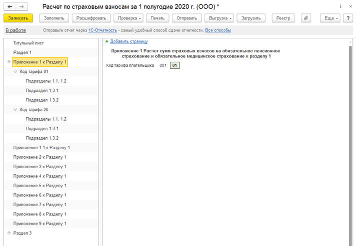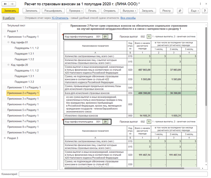 После проверки начисленных страховых взносов переходим к составлению отчета «Расчет страховых взносов». Данная отчетность также включает деление в зависимости от вида тарифа страховых взносов. Приложение 1 к разделу 1 включает подразделы по каждому коду тарифа плательщика: 01 – Плательщики страховых взносов, применяющие основной тариф страховых взносов; 20 – Плательщики страховых взносов, признаваемые субъектами малого или среднего предпринимательства (рис.2). Также Приложение 1 к Разделу 1 включает 2 таблицы для каждого кода тарифа плательщика (рис.3). Раздел 3 имеет дополнительные строки в таблице 3.2.1 «Сведения о сумме выплат и иных вознаграждений, начисленных в пользу физического лица»: строка НР – для отражения взносов с МРОТ, строка МС – для отражения взносов с остатка выплаты (рис.4).