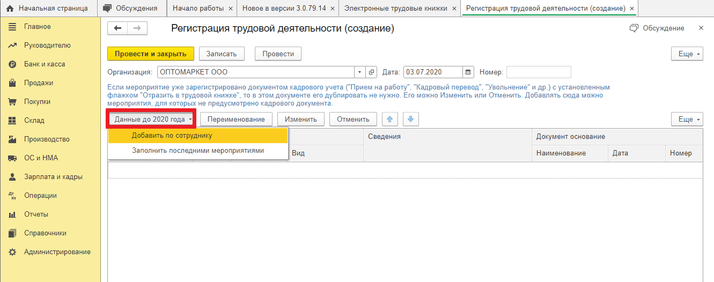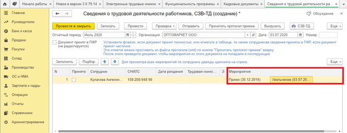Сформируйте отчет СЗВ-ТД, отраженные в документе Регистрация трудовой деятельности мероприятия подтянутся в отчет.