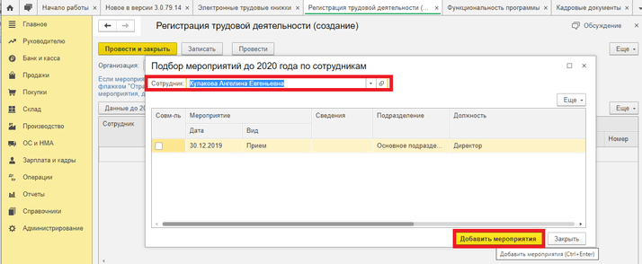 В открывшемся документе нажмите на кнопку Данные до 2020 года – Добавить по сотруднику. В открывшемся окне в поле Сотрудник укажите необходимого. Снизу в табличной части по выбранному сотруднику будет все мероприятия перенесенные из другой базы. Отметьте необходимое мероприятие и нажмите Добавить мероприятие. Далее запишите и закройте данный документ.