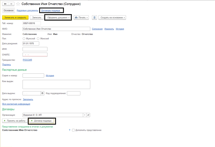Для создания договора гражданско-правового характера исполнитель заводится в справочнике «Сотрудники» (раздел Зарплата и кадры – Сотрудники), по которому заносятся все необходимые данные. Затем можно сразу из карточки сотрудника перейти к оформлению договора подряда по кнопке «Оформить документ», по ссылке «Договоры подряда» или по кнопке «+Договор подряда» (рис.1).
