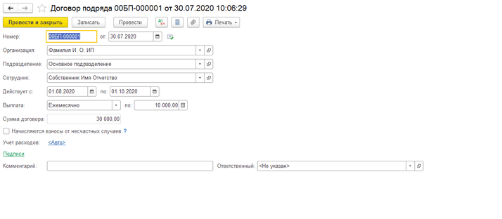 В поле «Организация» указывается организация, от имени которой заключается договор с физическим лицом. В поле «Подразделение» указываем подразделение, на которое будут списываться затраты по этому договору для отражения в учёте. В полях «Действует с... по...» указываем период действия договора, который также пойдёт в отчётность ПФР. В поле «Выплата» выбираем вид выплаты: По окончанию договора или Ежемесячно. Если выбираем вид «Ежемесячно», то в поле «по» указываем сумму вознаграждения за месяц и тогда «Сумма договора» заполняется автоматически. Также есть возможность начислять взносы от несчастных случаев. Можно задать определённый вид учёта расходов при необходимости. (рис.2)