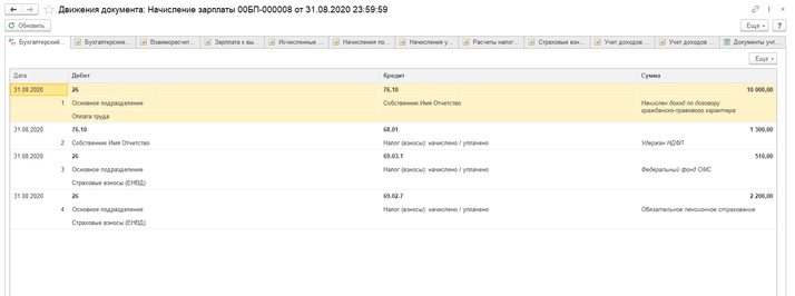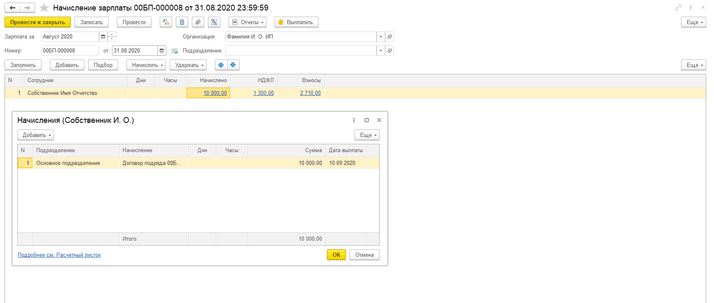 Начисление будет проводится по документу Начисление зарплаты. Предполагаемая дата выплаты дохода (поле «Дата выплаты») заполняется плановой датой выплаты зарплаты, указанной в карточке организации (рис.3, 4).
