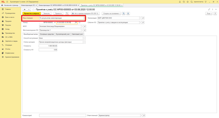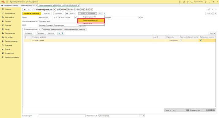 Раздел «ОС и НМА» - «Инвентаризация ОС» - Основные средства – Добавить – создаем ОС. Далее принимаем к учету ОС, из документа «Инвентаризация ОС» по кнопке «Создать на основание» - «Принятие к учету». Документ «Принятие к учету ОС» будет с видом операции «По результатам инвентаризации».