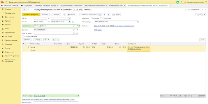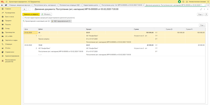 Рассмотрим пример. В феврале 2020 года было поступление услуг, сейчас поставщик предоставил скидку (кредит-ноту), НДС тоже скорректировали. То есть теперь мы должны сделать корректировку и восстановление НДС, так как НДС к вычету оставить не можем, нам нужно отразить НДС к уплате.