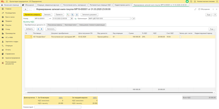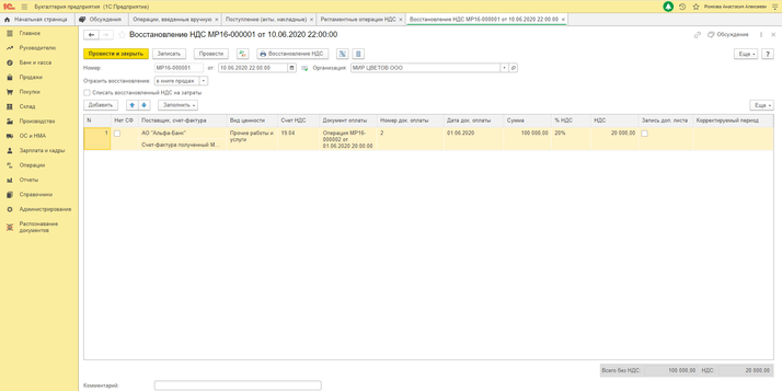 4) «Операции» — «Регламентные операции НДС» — Создать — «Восстановление НДС».