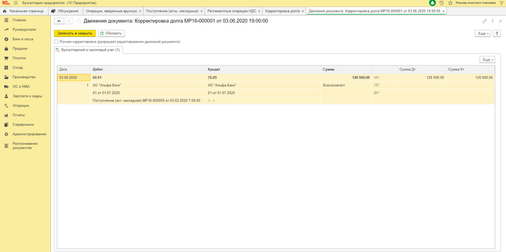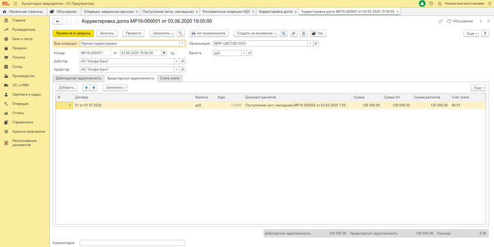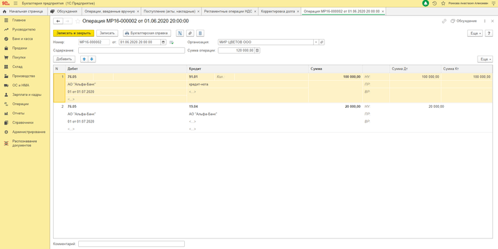 2) «Операции» — «Операции, введённые вручную» (получение кредит-ноты от поставщика)