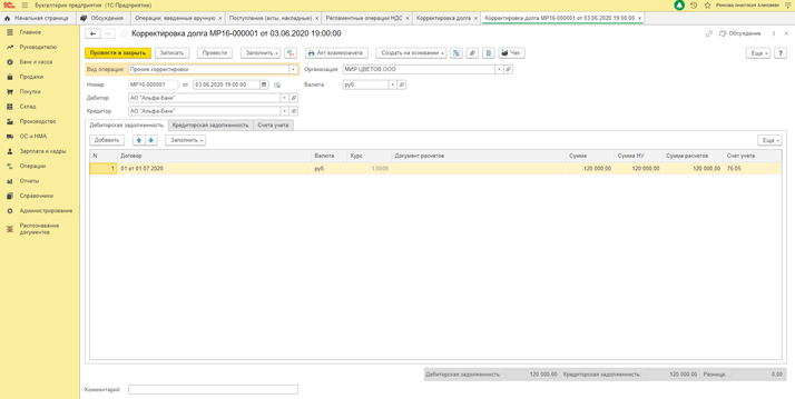 — Закладка «Дебиторская задолженность» — кнопка «Заполнить» (сумма из операции, введенной вручную)