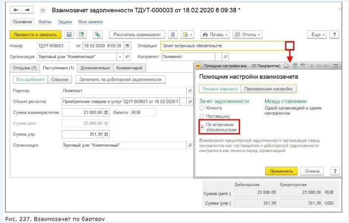 Поставщика регистрируем в программе как партнера, с установкой флажков Поставщик и Клиент. Для этого партнера указываем одно юридическое лицо – контрагента, от имени которого будут оформляться документы и определяем, по каким условиям требуется отгрузить товар. Т.к. отгрузка товара без предоплаты, то при оформлении документов используем соглашение с условиями отгрузки товаров в кредит. Оформляем документ «Приобретение товаров и услуг», далее отгрузку товара оформляем с помощью документа «Реализация товаров и услуг» с указанием соглашения с клиентом, далее устанавливаем статус «Реализовано», затем в разделе «Казначейство», создаем документ «Взаимозачет задолженности» в котором выбираем операцию «Зачет встречных обязательств». По кнопке « Рассчитать взаимозачет» программа предложит нам ту минимальную сумму, которую мы можем зачесть в качестве взаимозачета.
