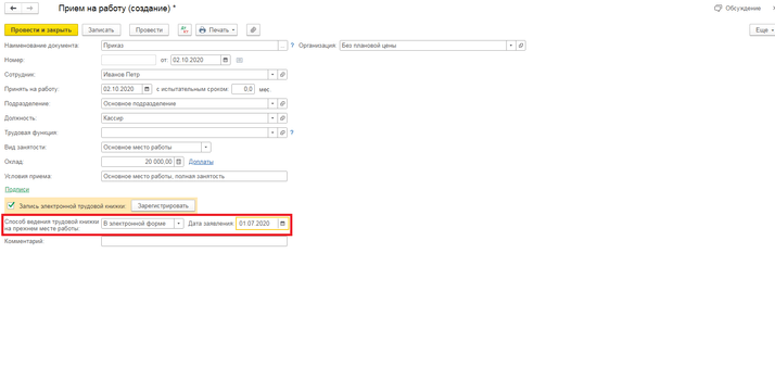 Для того чтобы внести информацию о способе введения трудовой книжки с предыдущего места работы, необходимо перейти в раздел Зарплата и кадры - Кадры - Кадровые документы - Прием на работу.