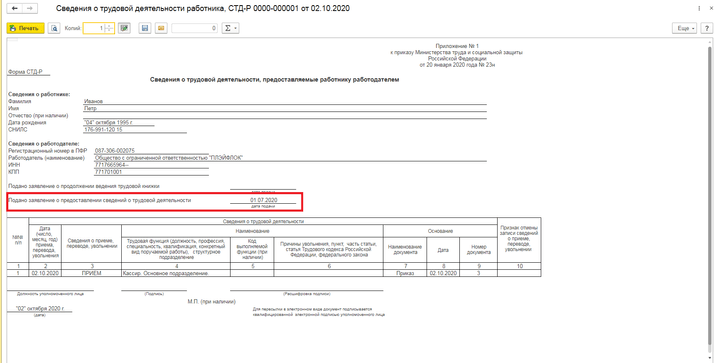 После проведения приема и отражения его в СЗВ –ТД, можно заполнить СТД-Р, в печатной форме которого, дата подачи заявления будет отражена.