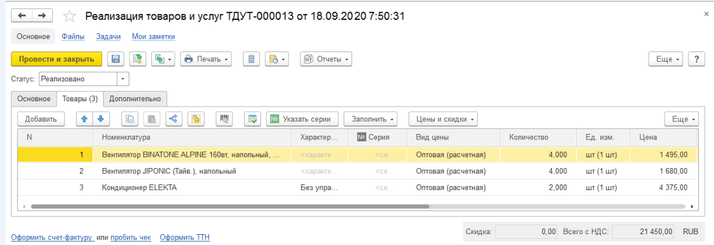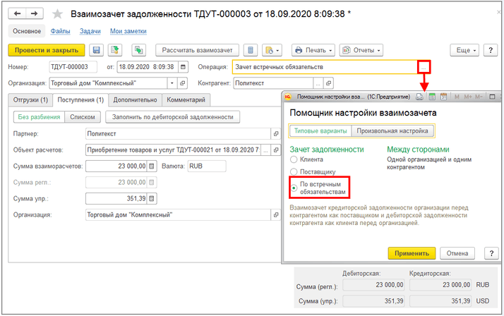 Рассмотрим оформление данной операции на примере. Предприятие получило от фирмы «Политекст» товар «Холодильники». Фирма «Политекст» в оплату данного товара согласилась принять от торгового предприятия имеющийся у нее товар «Вентиляторы». Для оформления данной операции в программе зарегистрируем фирму «Политекст» как партнера, с установкой флажков «Поставщик» и «Клиент». Для этого партнера указываем одно юридическое лицо – контрагента, от имени которого будут оформляться документы. Кроме этого определим по каким условиям ей требуется отгружать товар. Поскольку мы будем отгружать товар без предоплаты, то при оформлении документов будем использовать соглашение с условиями отгрузки товаров в кредит. Поступление от фирмы «Политекст» товара «Холодильники» оформляем с помощью документа «Приобретение товаров и услуг». Далее отгрузку товара «Вентиляторы» в фирму «Политекст» следует оформить с помощью документа «Реализация товаров и услуг» с указанием соглашения с клиентом. Отгрузку следует оформлять по кредитному соглашению, в документе «Реализация товаров и услуг» устанавливаем статус «Реализовано». Затем создаем документ «Взаимозачет задолженности» (раздел Казначейство), в котором выбираем операцию «Зачет встречных обязательств», а в качестве контрагента указываем «Политекст». Суммы дебиторской и кредиторской задолженностей можно заполнить автоматически при нажатии кнопки «Рассчитать взаимозачет».