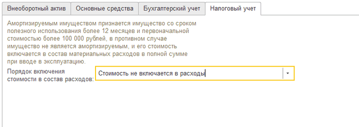 Если стоимость объекта ОС не учитывается в целях налогообложения по основаниям, предусмотренным ст. 256 НК РФ, тогда должна формироваться временная разница. Для этого в документе «Принятие к учету ОС» на вкладке «Налоговый учет» в поле «Порядок включения стоимости в состав расходов» выберите «Стоимость не включается в расходы» (рис. 1). Тогда при закрытии месяца амортизация будет начислять по БУ, а по НУ формируются временные разницы (рис.2).
