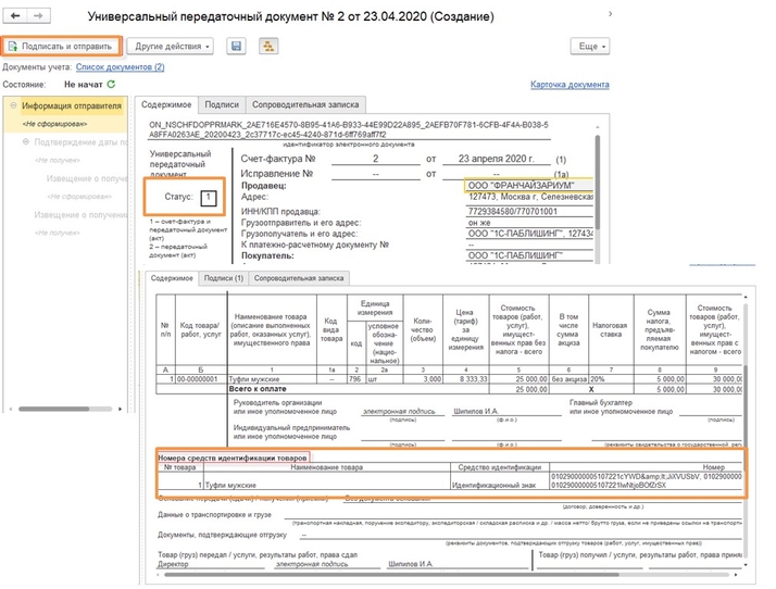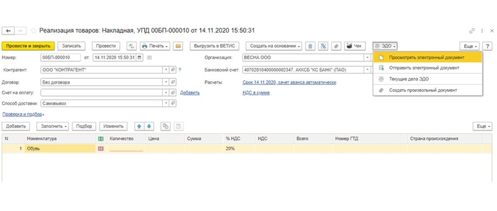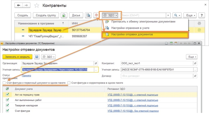 Коды маркировки можно передать только в формате УПД, поэтому перед первой отправкой необходимо произвести настройки с контрагентами. Справочники — контрагенты — выделяем нужного контрагента — ЭДО — настройки отправки документов — ставим галку на «Счёт-фактура и первичный документ в одном пакете» — записать и закрыть (рис. 1).