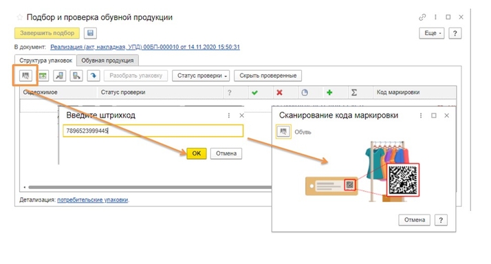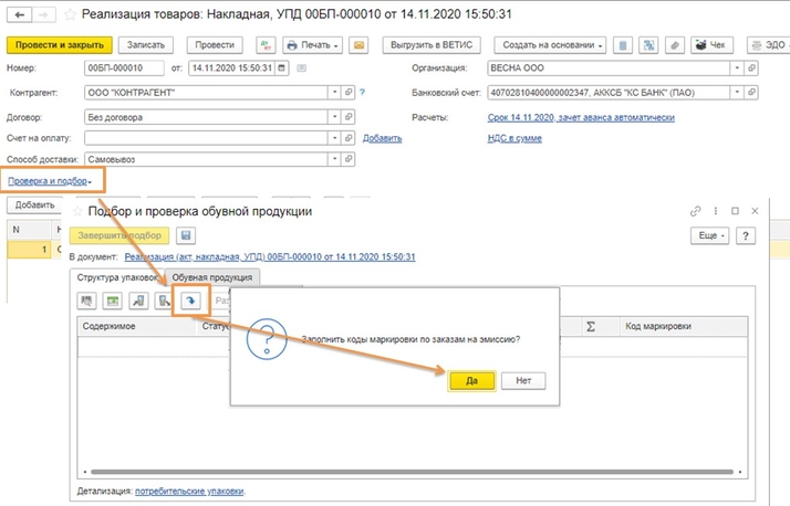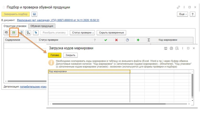 Настройка готова, переходим к оформлению документа реализации. Перед формированием электронного УПД с маркируемой продукцией необходимо подобрать коды. Если ранее код маркировки эмитировали в 1С, то коды можно загрузить из заказа на эмиссию (рис. 2). Если коды были эмитированы не в программе, то их можно добавить либо сканированием (рис. 3), либо через загрузку в Excel (рис. 4).